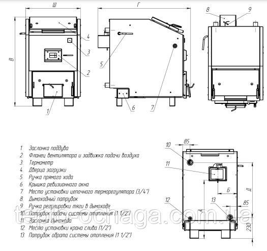 Брикети, дрова та вугілля є паливним матеріалом для котла.